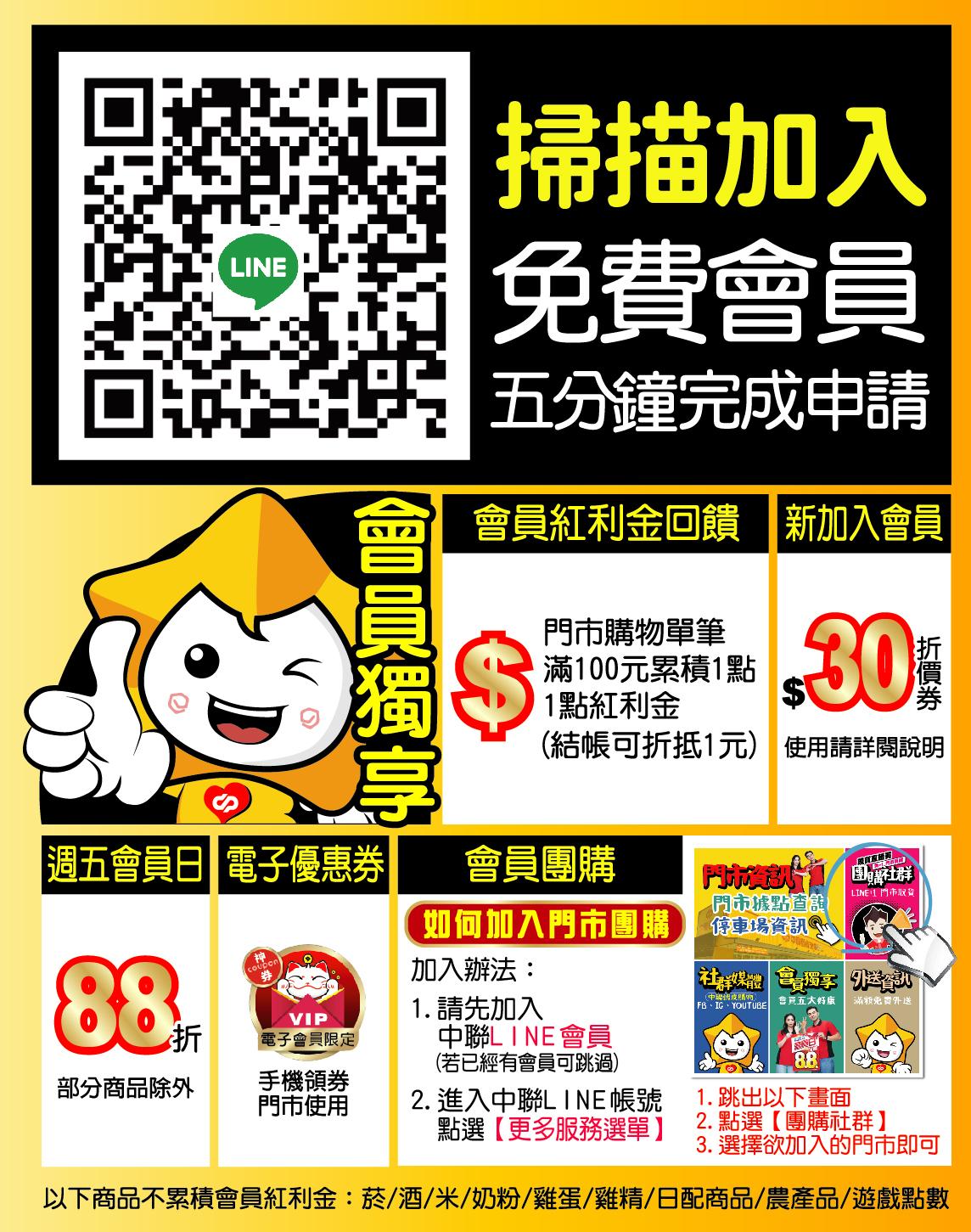 於台中市購物節期間內 加入會員享5大好康 ✔️會員五大好康⬇️ 👍新辦會員送30元折價券 👍購物累積點數享紅利回饋 👍週五會員日88折 👍團友商品,獨家限量 👍手機領優惠券門市使用 ❤️欲加入會員,請先加好友❤️ 中聯百貨官方帳號Line ID:@ZL999SHOP商品介紹