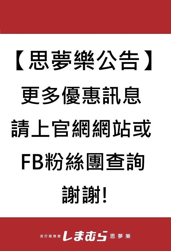 しまむら思夢樂為世界第10大,日本第2大的服飾連鎖店。店內販售:男裝、女裝、童裝、寢具、家飾、雜貨、包包、配件、鞋子、內著類等眾多商品。追求平價、高品質的生活,滿足消費者需求為目標。全臺共有47家分店、臺中地區擁有10家分店、為全臺灣思夢樂最多的區域。優惠內容