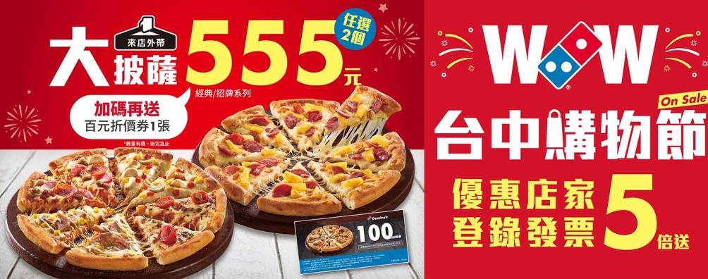 1,外帶任選2個經典/招牌系列大披薩只要 $555,再送100元折價券(數量有限,送完為止)