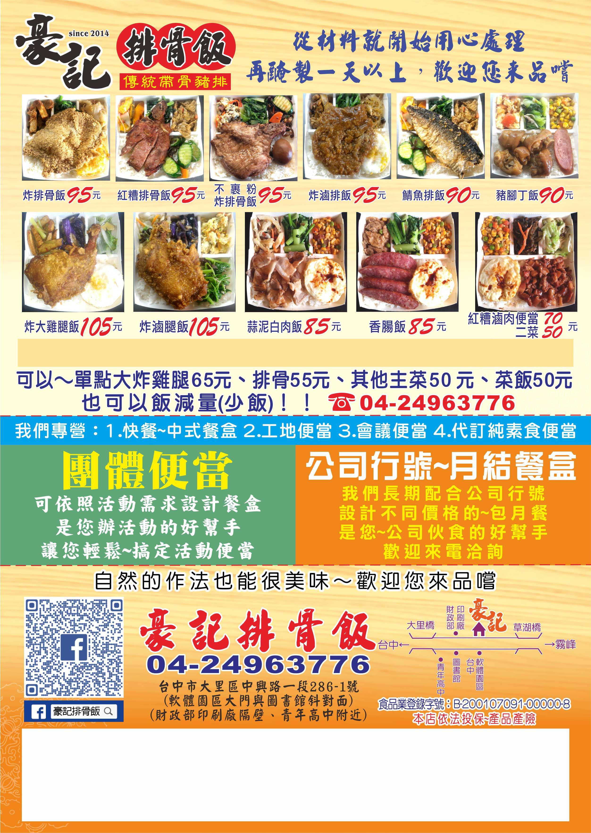 我們專賣傳統帶骨排骨飯、雞腿飯... 對健康有責任,所以食材採用最自然的做法。 堅持不用回鍋油炒菜,不用化學香精增味~增色。 願大家都平安健康~★星期日或其它時段有接團體便當★優惠內容