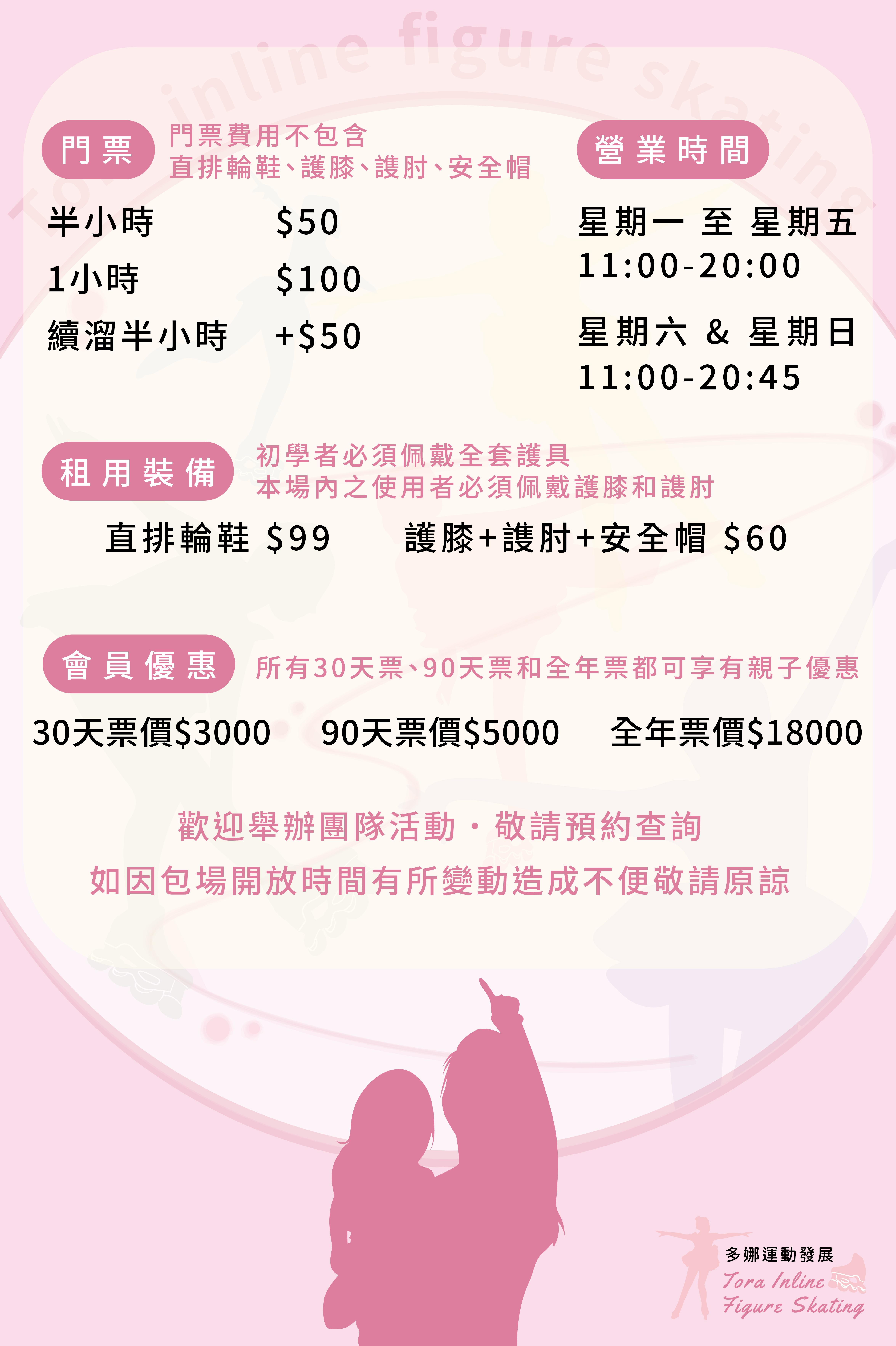 台中唯一室內全天候,既安全又適合親子互動的花式直排輪活動場地。 我們是由幾位海歸教練所組成的花式直排輪團隊,以創造一個讓全台中熱愛直排輪活動的孩子們及家長,安心舒適度且風雨無阻的活動空間為宗旨,期待對直排輪有興趣的大人小孩加入我們,創造屬於自己獨一無二的直排輪世界。優惠內容