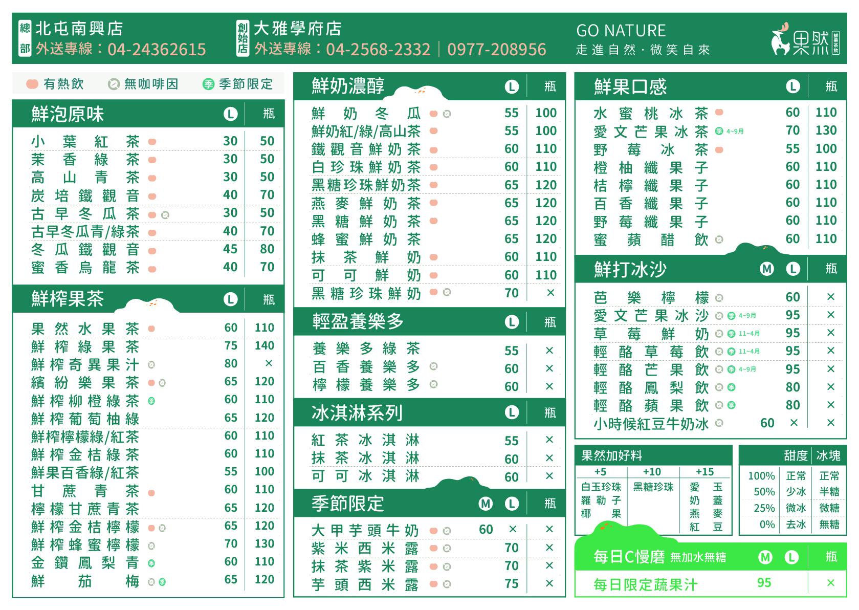 冷壓慢磨蔬果汁、外帶式鮮果茶飲、新鮮水果製品。 果然堅持使用台灣新鮮水果入茶, 當季水果與茶湯的黃金比例組合, 混搭出屬於台灣滋味的透心涼!優惠內容