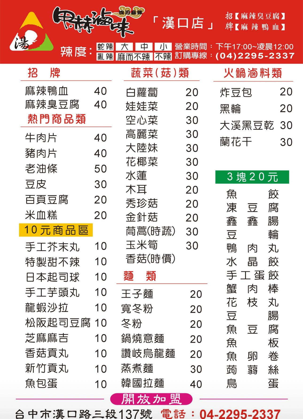 我們家是湯的滷味,類似麻辣燙 湯頭都是可以喝的,可辣可不辣 滿足吃辣及不吃辣的顧客。 商品展示讓顧客夾取,選擇所愛 我們有別於外面販售的鴨血、臭豆腐 顧及到讓顧客吃到食材的原味 各自分別滷,讓味道不會互相混合 成就一碗集各食材本味的美味湯滷 湯頭可分為: 不辣➡️麻而不辣➡️微辣 小辣➡️中辣➡️大辣➡️亂辣➡️蛇辣 店休日:每週二優惠內容